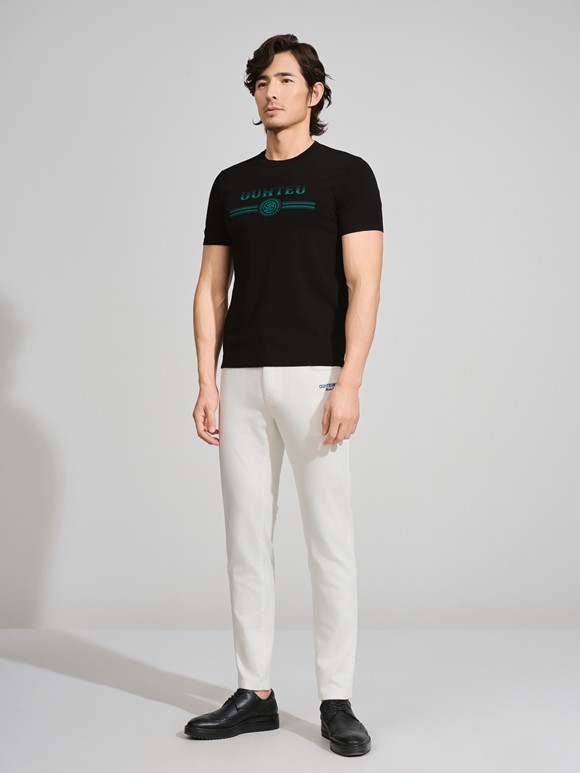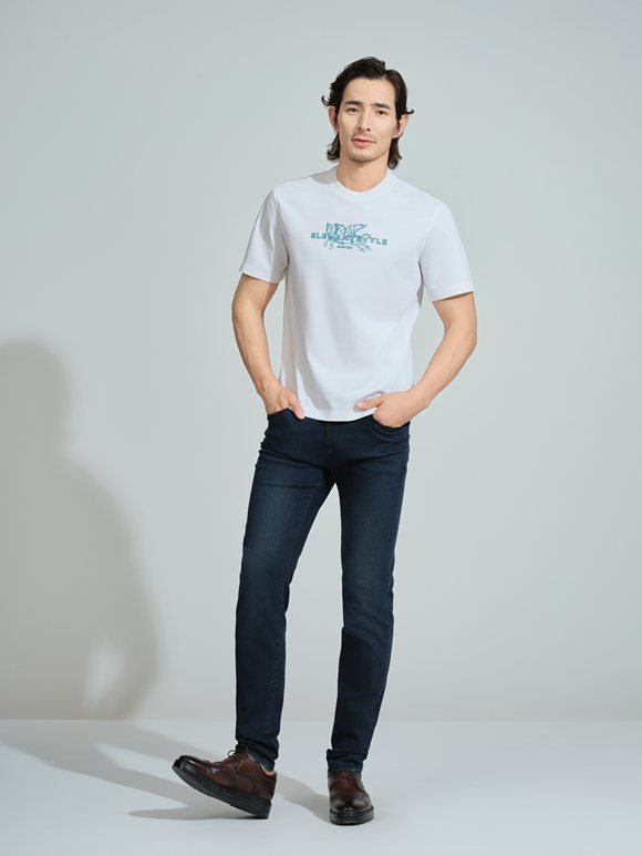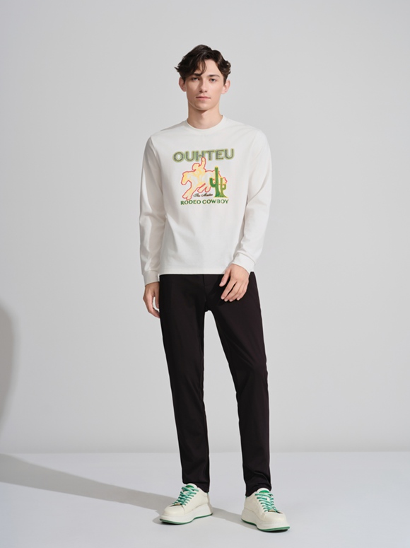 白色T恤以精致圖案點綴,清新自然;深色牛仔褲剪裁利落,勾勒修長線條;棕色皮鞋質(zhì)感沉穩(wěn),映襯整體造型。日常通勤或休閑出行,詮釋現(xiàn)代都市男性的從容與品位。